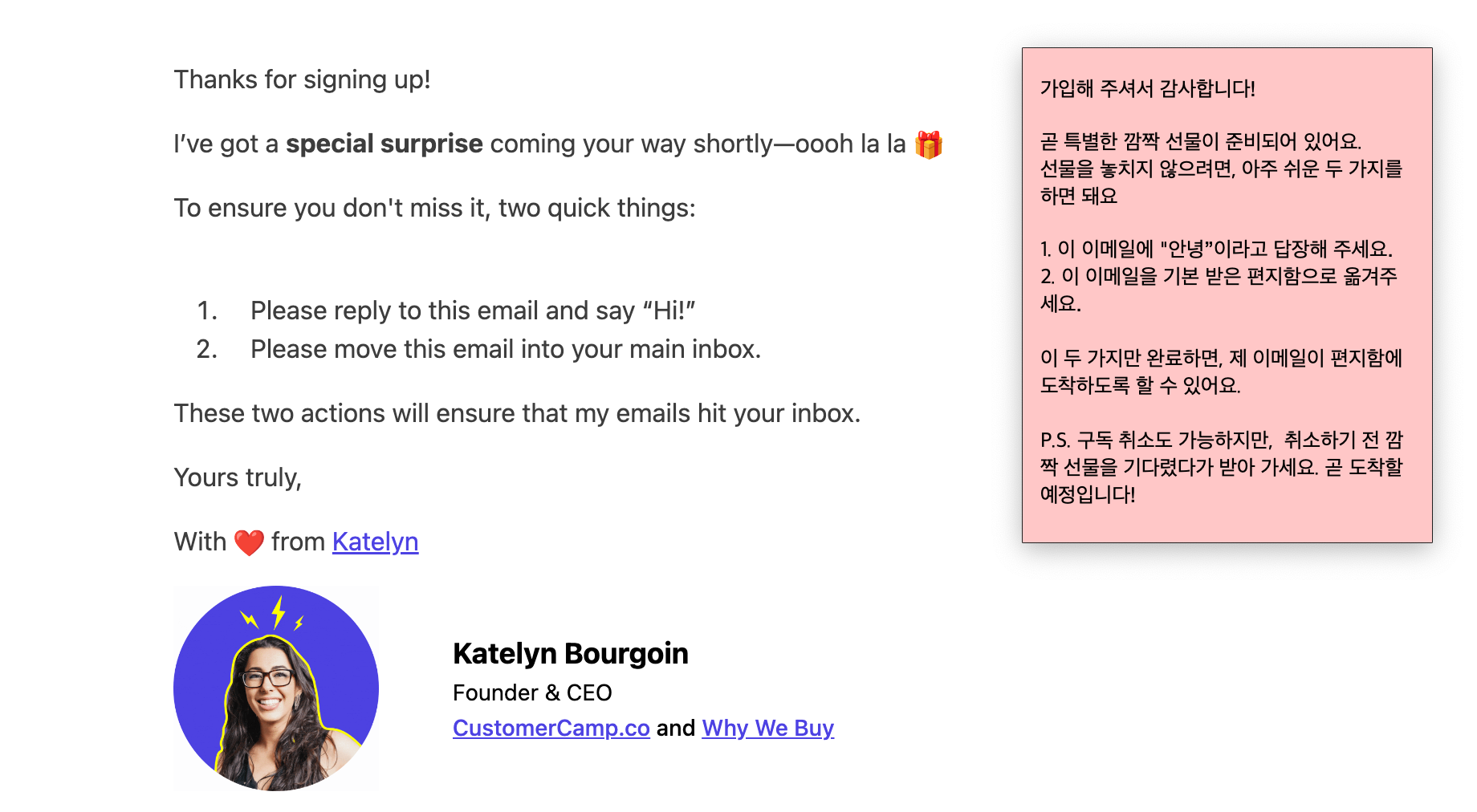 Katelyn은 웰컴 메일을 똑똑하게 세팅합니다. 메일에는 2가지 장치가 포함되어 있는데요. 1. 곧 깜짝 선물이 도착하니 잠시 기다려라 2. 선물이 메일함에 잘 도착하기 위해서는 간단한 액션을 해달라는 요청이었습니다. 액션은 정말 간단해요. 내 메일을 스팸함에서 꺼내 ‘기본 편지함’으로 옮기고, ‘안녕’만 쳐서 답장하면 끝입니다. 구독 타이밍이 뉴스레터에 가장 관심도가 높을 때임을 알고, 이를 공략해 구독자가 바로 행동할 수 있도록 만든거죠.