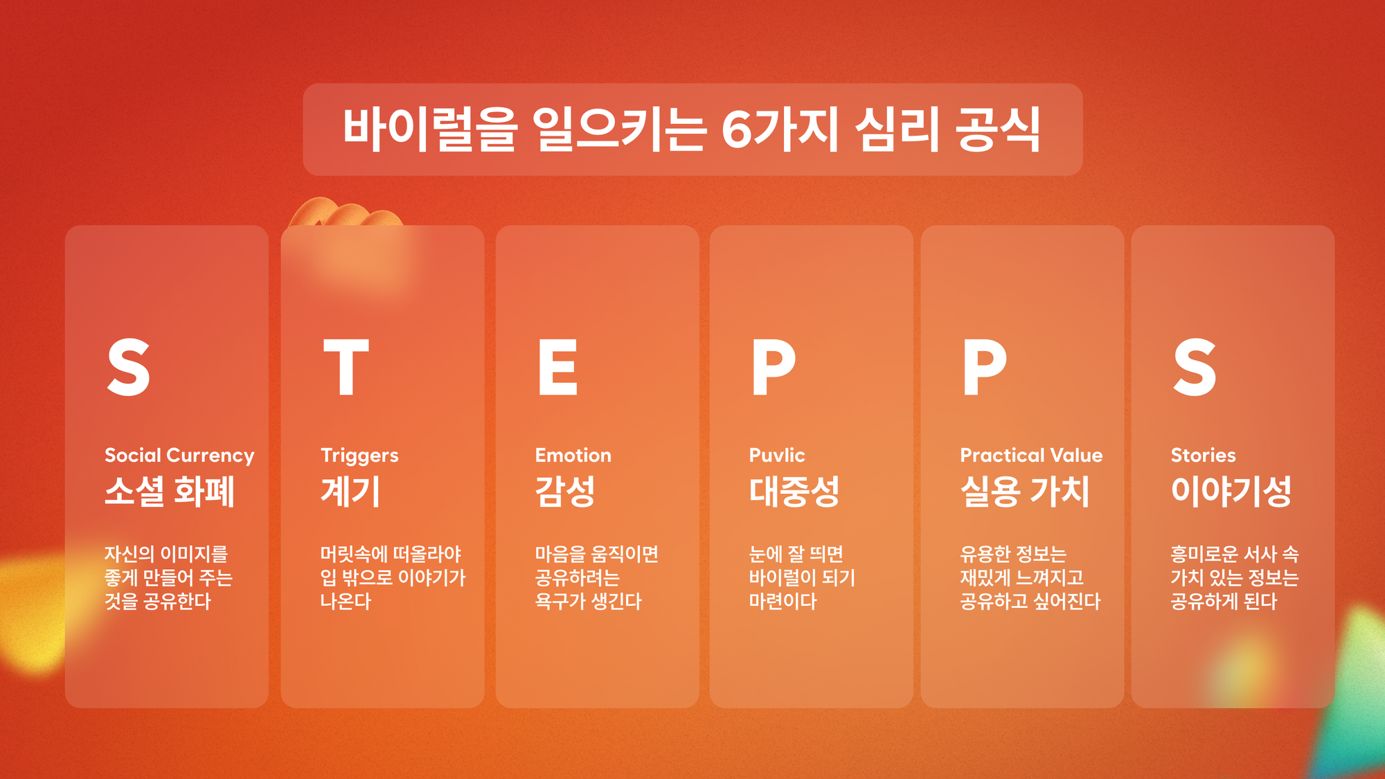 본질적인 바이럴 비밀을 파헤치기 위해 바이럴계의 바이블 <컨테이져스>를 읽어봤어요. 와튼 스쿨 마케팅 권위자 조나 버거가 쓴 ‘바이럴을 일으키는 심리 공략집’인데요. 정말 비슷한 콘텐츠임에도 어떤 건 터지고, 어떤 건 터지지 않는 현상을 보며 그는 바이럴의 비밀이 너무 궁금해졌고, 10년을 연구한 끝에 마침내 6가지의 공식을 찾아냅니다. 대부분의 바이럴 사례는 이 6가지 안에 포함된다고 하고요. 일명 ‘STEPPS’입니다.