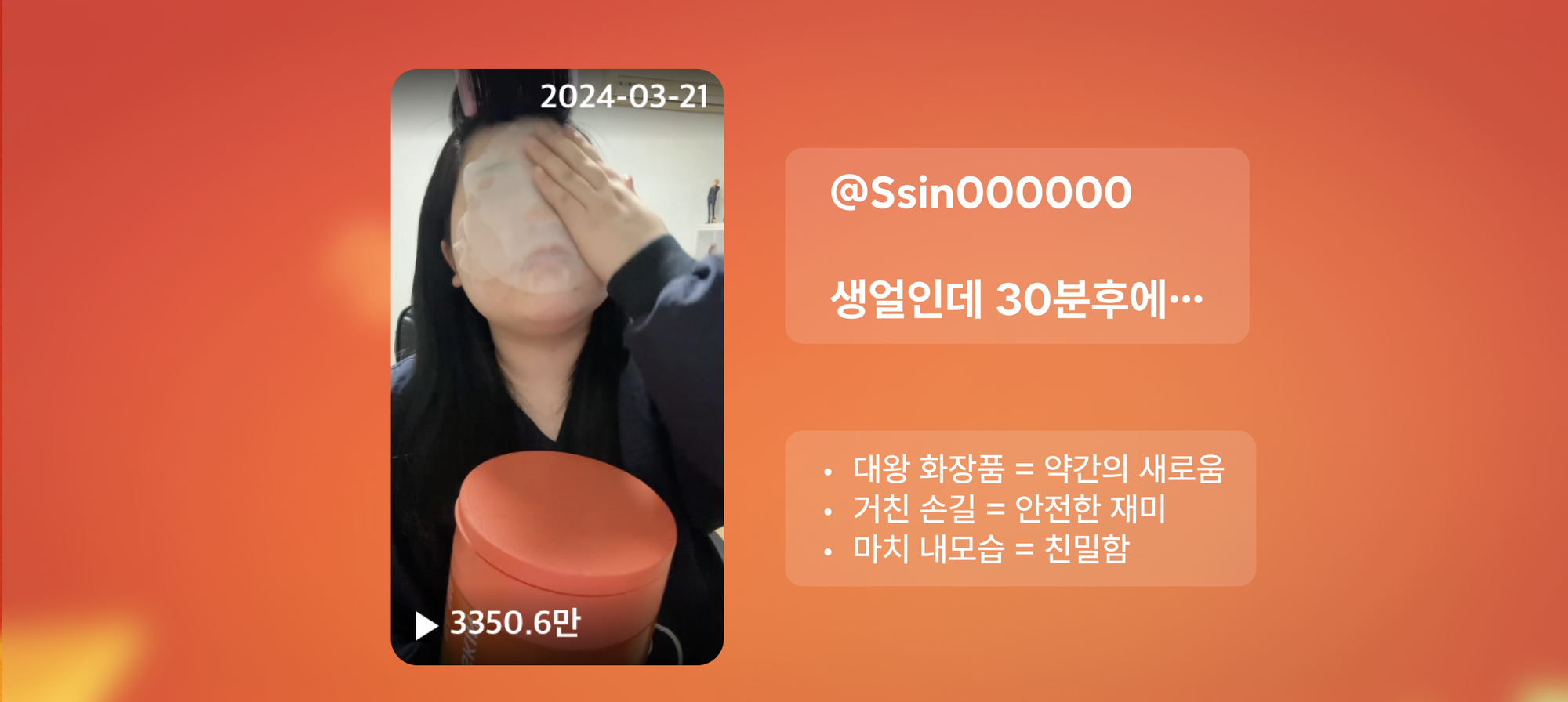사람들은 본능적으로 리스크를 피하는데요. 때문에 위험 부담이 없는 선에서 재미있거나, 약간 앞서가는 것처럼 보이는 콘텐츠가 반응이 좋다고 해요. 스스로 재밌다는 확신을 가지면 바이럴의 문턱이 낮아진다고요. 하지만 이런 흥미 위주의 바이럴의 경우 성공과 실패가 잦고, 성공하더라도 일시적이라는 단점이 있어요. 이 방법을 노리려면 ‘양치기’에 집중해 최대한 많이 노출하는 것이 중요해 보이네요.