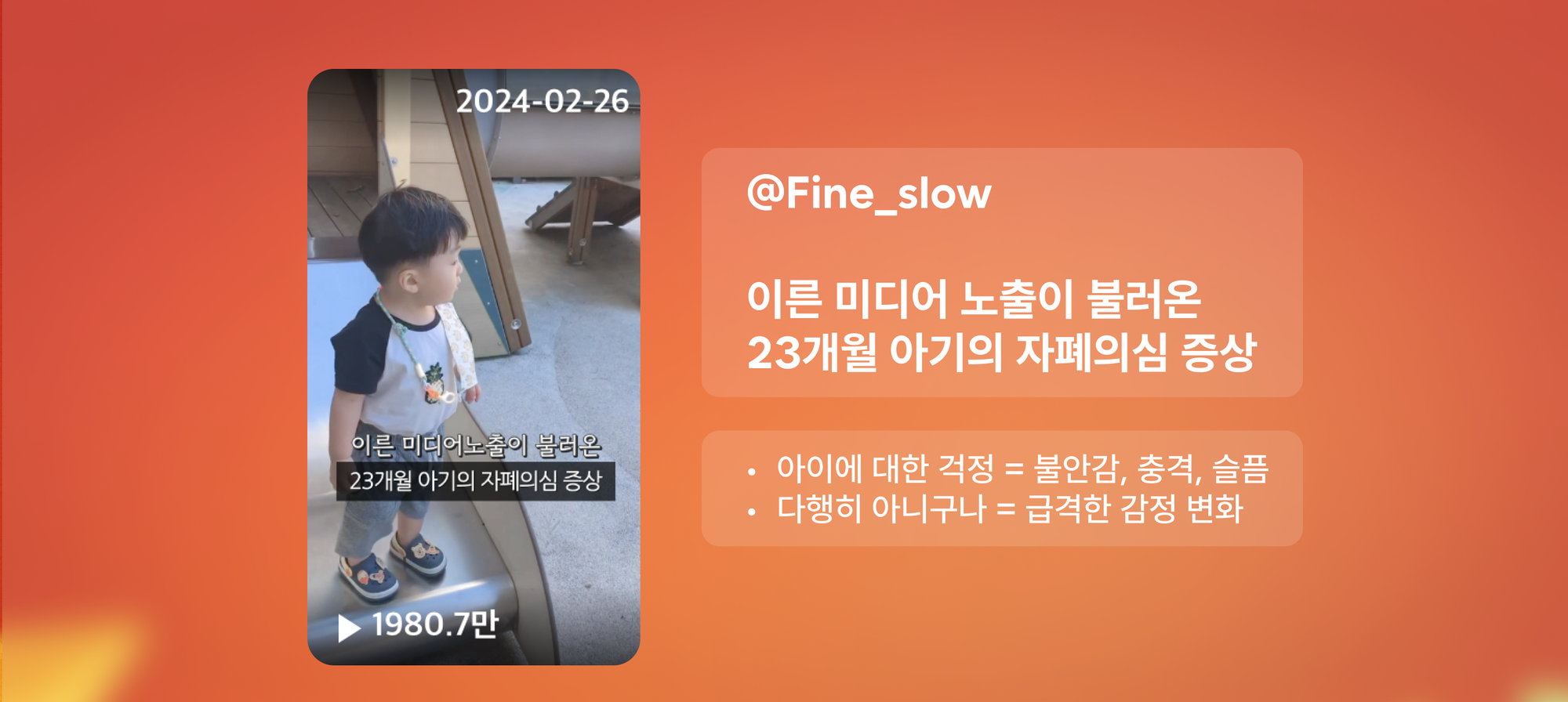 어머 23개월 아기가 자폐 의심 증상을 보인다고? 어떡해…정말 노래를 따라 부르네. 미디어 노출이 심각한 영향을 끼치나봐(🧠 불안, 슬픔) 근데 캡션을 읽어보니 증상이 보여 걱정했지만 아니었다고 하네. 정말 다행이다(🧠 급격한 감정 전환, 안심, 만족감)